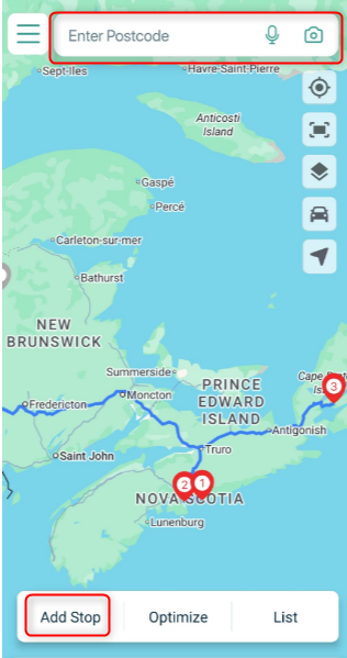 Select 'Add stop' button or start typing a postcode into the slot at the top of your map view screen - this will open the 'Add stops' screen.